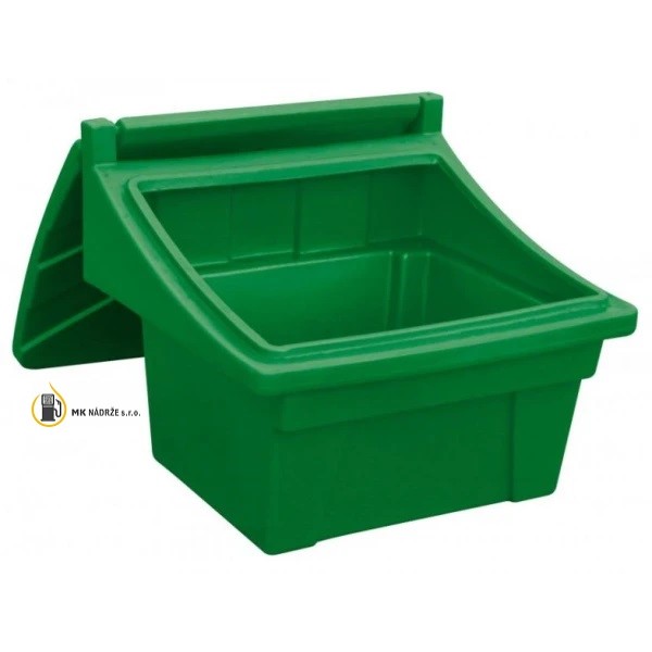 Zásobník je vhodný pre rôzne druhy posypových materiálov ako sú piesok a soľ, alebo skladovanie akýchkoľvek sypkých materiálov. Uloženie zásobníkov je vhodné vo verejných priestoroch na údržbu chodníkov, zastávok električiek a autobusov, železničných staníc, parkovísk atď. Nádoby sú odolné voči mechanickému poškodeniu, zlému počasiu a UV žiareniu, vďaka PE materiálu. Skladovanie a preprava sú jednoduché vďaka ich hmotnosti a možnosti stohovania, navyše sú prispôsobené na manipuláciu s vysokozdvižným vozíkom. V ponuke sú nádoby v žltej, modrej, zelenej a červenej farbe v objemoch 50, 100, 150, 300 litrov. Zásobníky boli certifikované so zárukou 5 rokov.