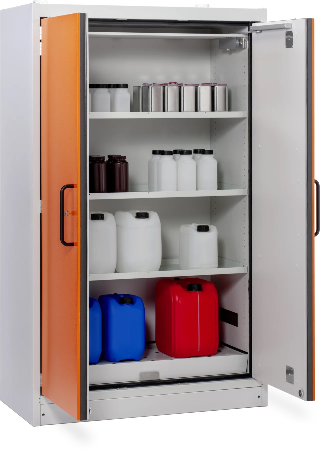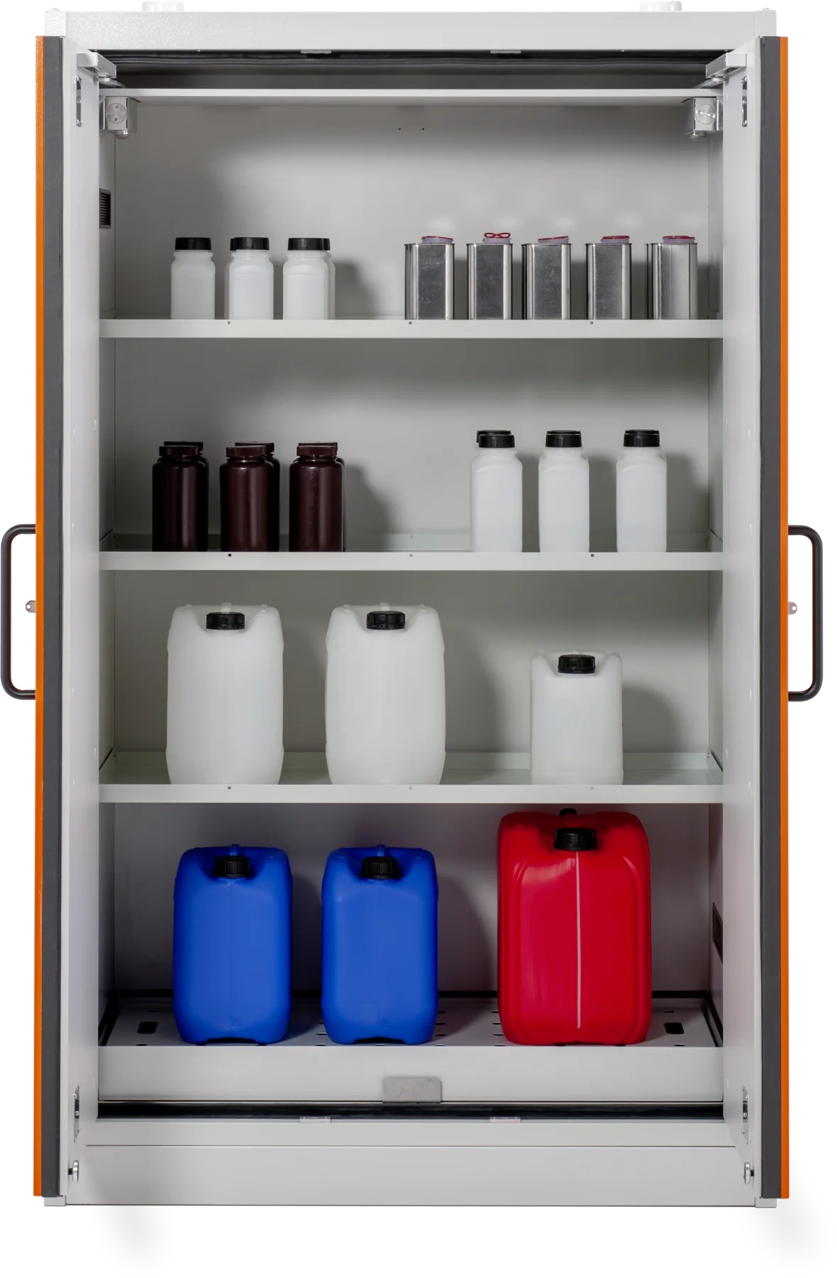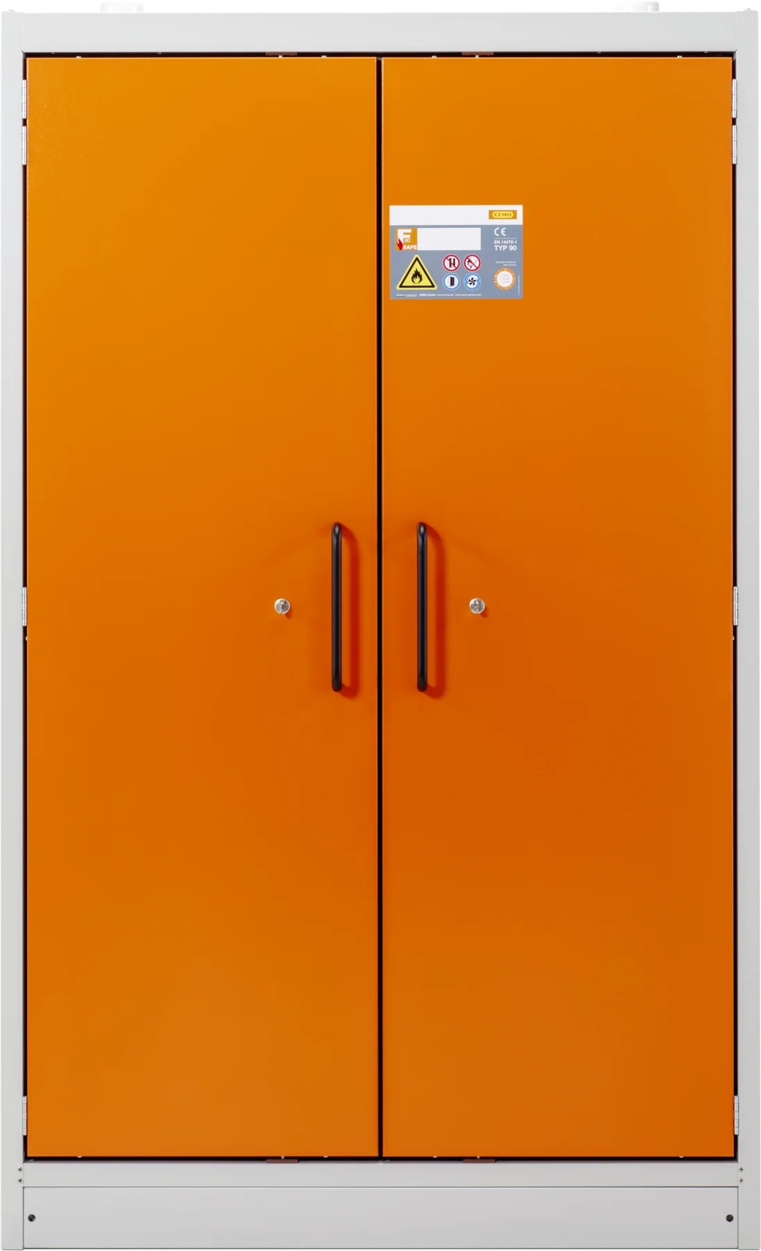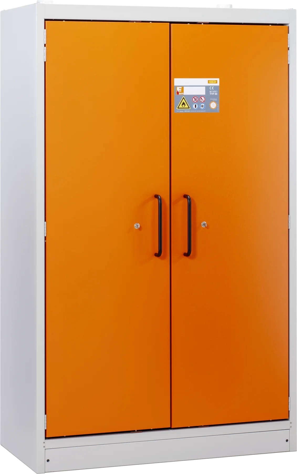 Skriňa na skladovanie nebezpečných a horľavých kvapalín s protipožiarnou 90 min. ochranou, certifikovaná podľa EN 14470-1 umožňuje skladovanie kanistrov do 60 litrov. Na výber je skriňa so záchytnou vaňou 33, alebo 66 litrov. Povrchová úprava skrine a regálov je lakovaná RAL2008/ oranžová s vysokou odolnosťou vhodná na skladovanie chemikálii a horľavín.