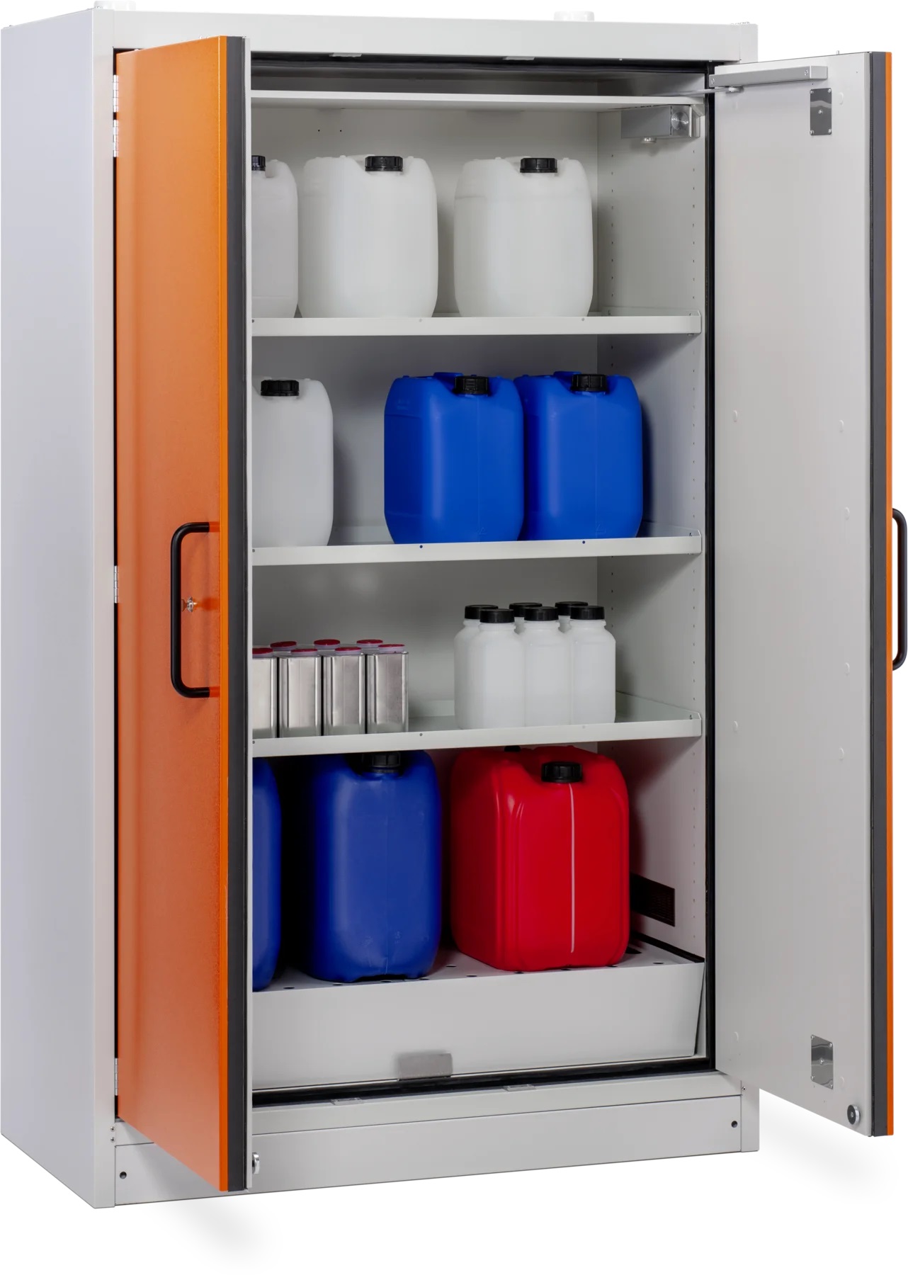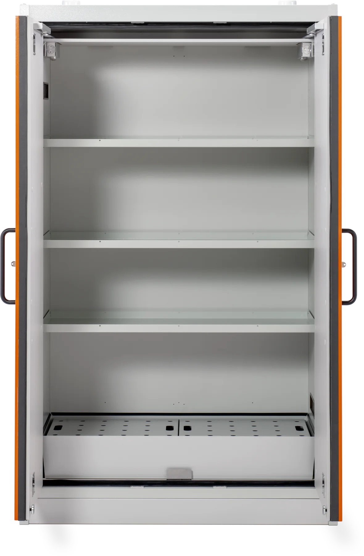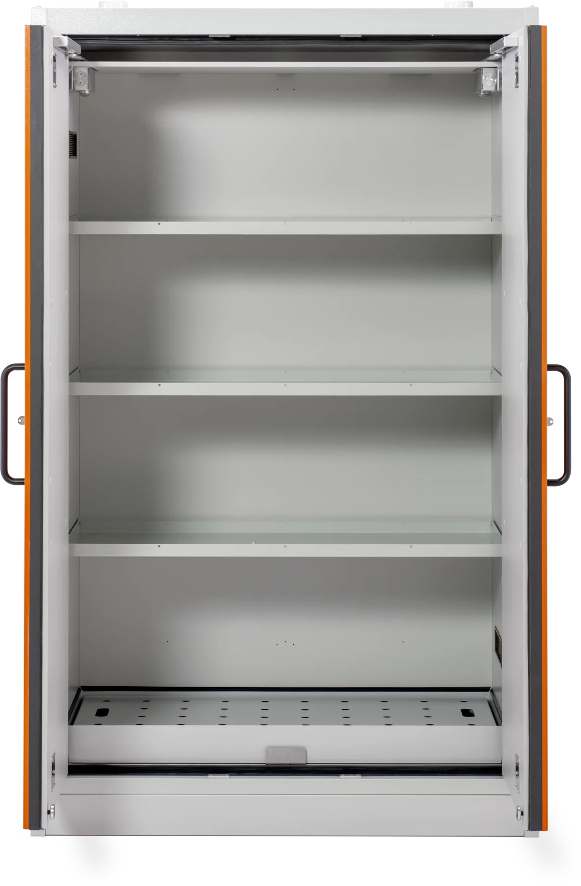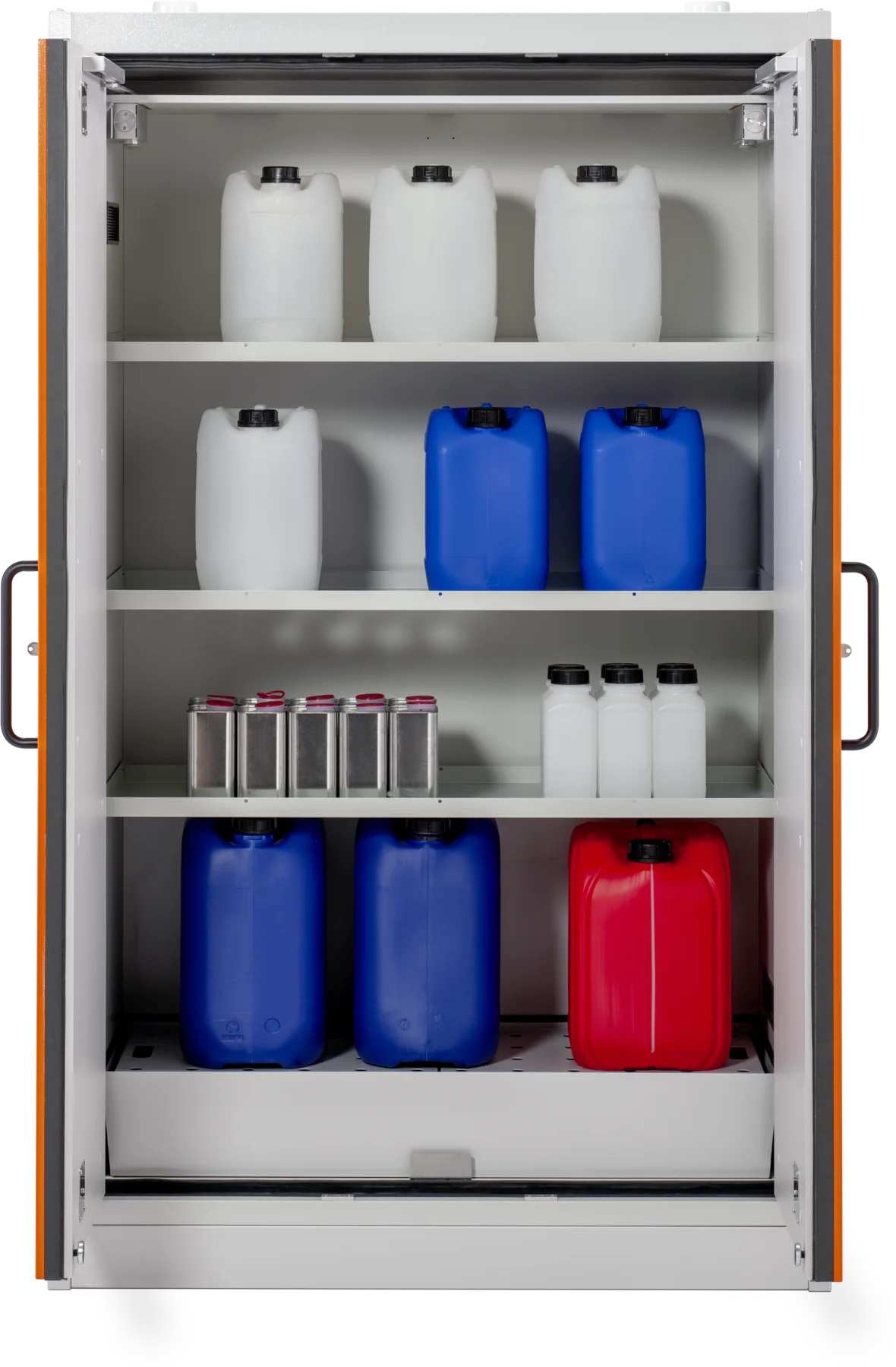 Skriňa na skladovanie nebezpečných a horľavých kvapalín s protipožiarnou 90 min. ochranou, certifikovaná podľa EN 14470-1 umožňuje skladovanie kanistrov do 60 litrov. Na výber je skriňa so záchytnou vaňou 33, alebo 66 litrov. Povrchová úprava skrine a regálov je lakovaná RAL2008/ oranžová s vysokou odolnosťou vhodná na skladovanie chemikálii a horľavín.