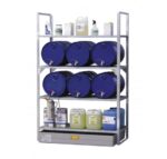 Skladovacie regály pre uskladnenie až do12x60 lit. sudov, alebo malých kanistrov, sú priestorovo nenáročné, dodávané so záchytnou vaňou vyrobenou z 100% antikorózneho GRP materiálu ( sklolaminátu) s objemom až 150 lit., alebo oceľovou vaňou s roštom a oporou pre 6×60 lit. sudy. Regály sú vyrobené z pozinkovanej ocele ,sú odolne voči korózií a vodne na uskladnenie olejov, kyselín a pod.